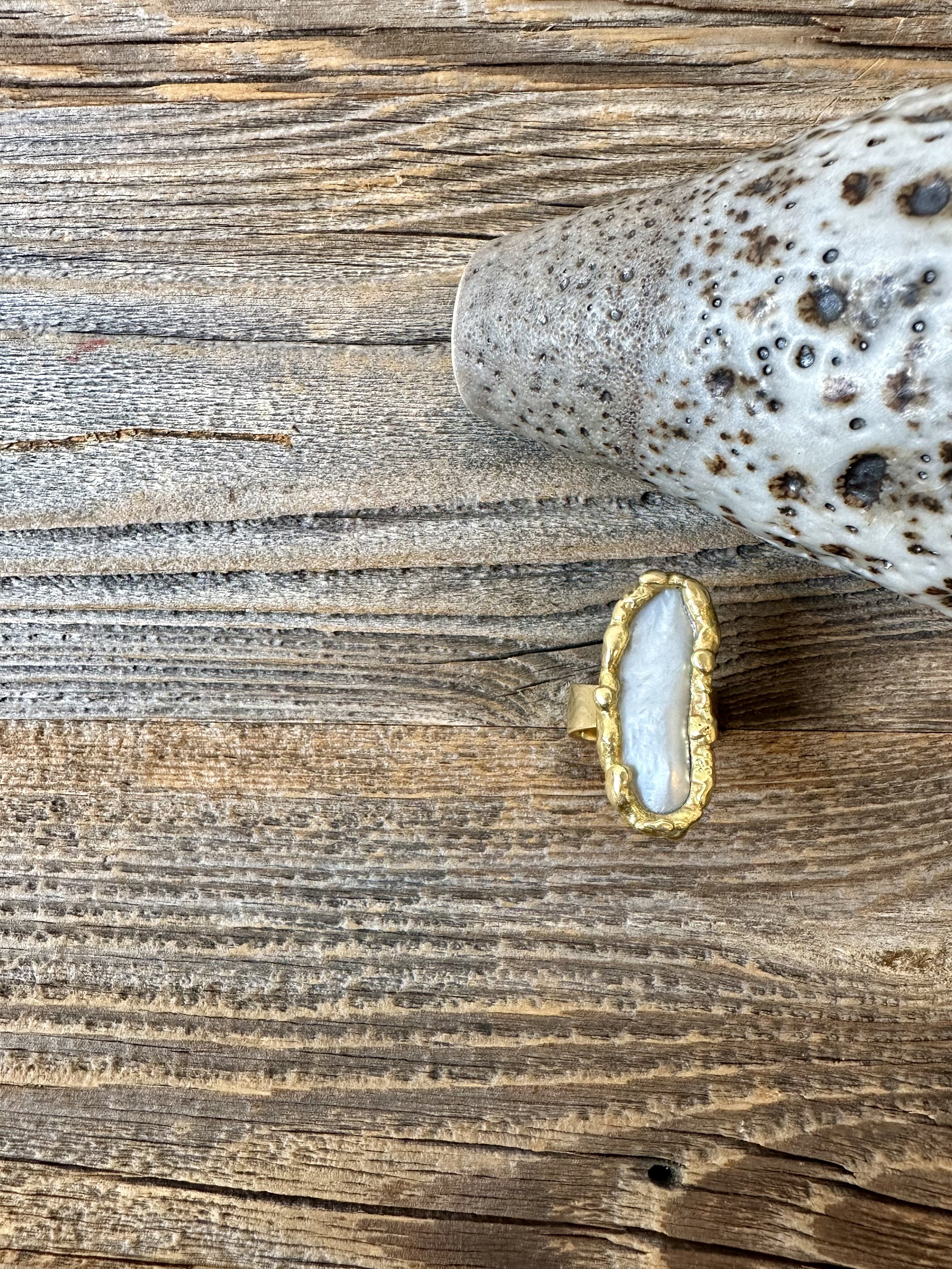 An elongated blister pearl within heavy 18K mount and triangular shank.