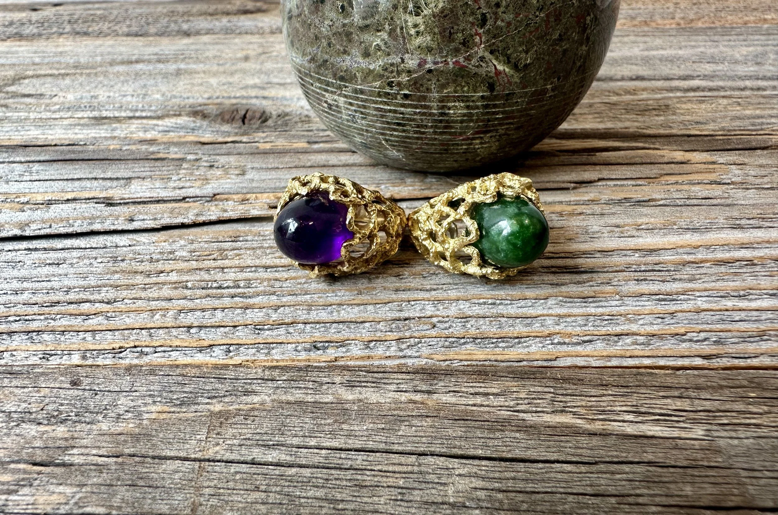 A pair of amethyst and nephrite cabochon rings in textured 18K gold mount.