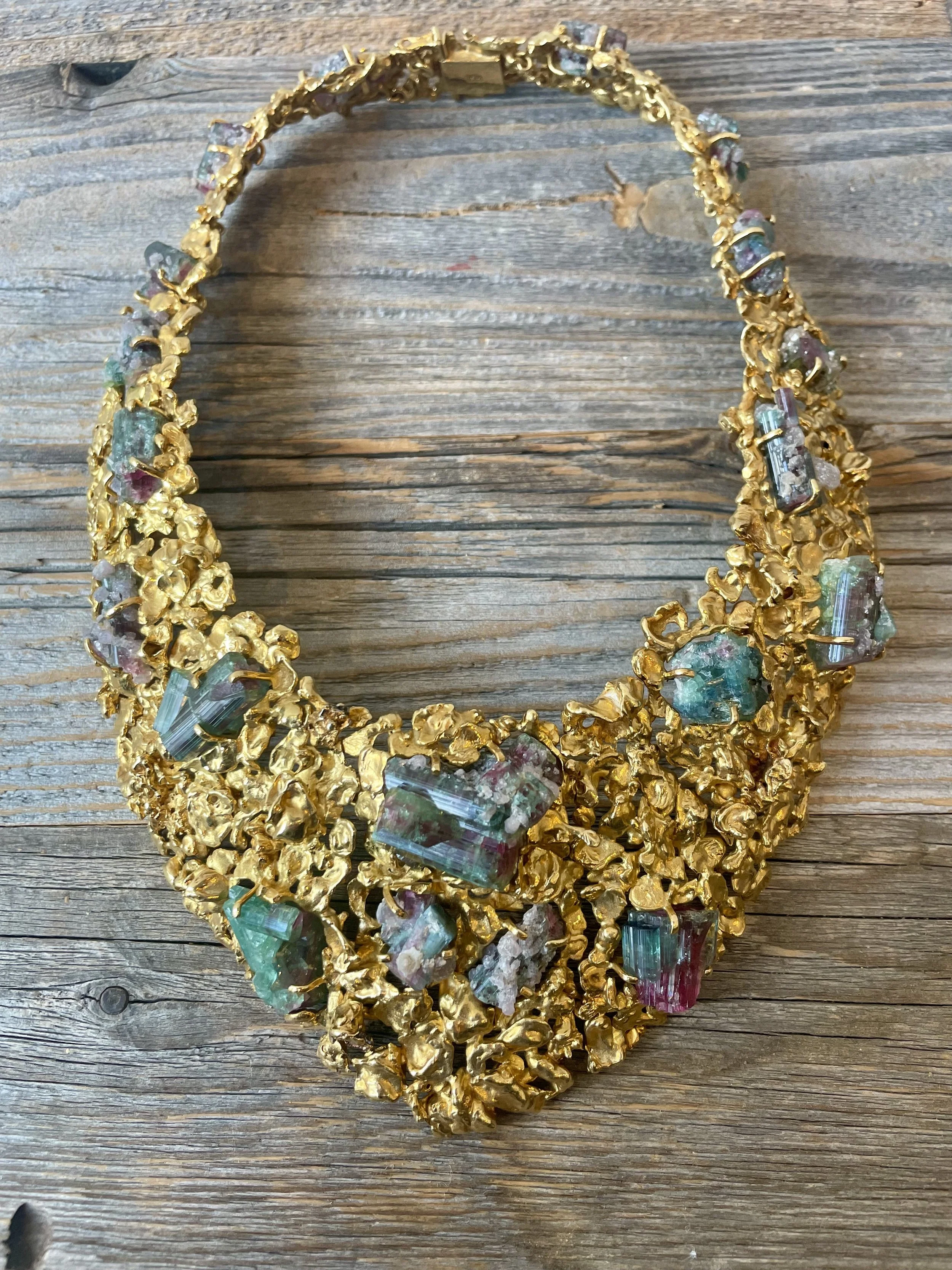 Very heavy 18K gold abstract bib mount with rough (uncut/polished) watermelon tourmaline.